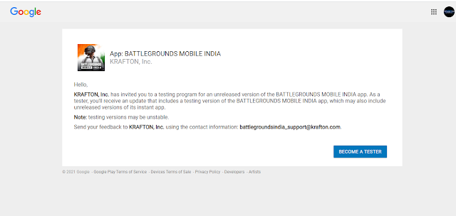 After You will See another page about APP Battlegrounds Mobile India Invitation Tab and Under that you will see Become a Tester. Just Click On That.